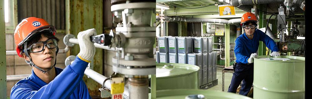 長くて2時間、安定しづらい製品では10分ごとに温度を確認し、1日4回は分析による品質確認もします。時には猛暑で添加剤が蒸発してしまって蒸留がうまく進まず、添加剤の追加量の調整に苦労したことも。想定外のことも起きますが、1日が計画通り進むとうれしさがあり、プラスアルファの作業まで進められた日はなおさらです。社内研修時に教わった「後工程はお客様」の言葉を大切に、後を引き継ぐメンバーや他部署のやることがなくなるくらい、自分が作業を進める意識で臨んでいます。その意識をみんなが持っているからか、仕事が進めやすく人間関係は良好。プライベートの話も仕事の意見も言いやすい環境の中で、循環型社会に貢献している手応えを味わっています。
