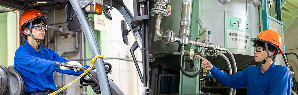 大学時代は応用化学科で、研究室では金属と有機化合物の錯体を研究していました。化学系の知識を活かしたモノづくりができる企業を探して、溶剤廃液の収集量No.1である三和油化工業に興味を持ち入社。現在は、大手メーカーから委託された製品などの製造を担当しています。例えば使用済みの有機溶剤を、低温蒸留で不純物と分け、お客様ブランドの再生品として販売される純度99.9%の製品をつくるなど。この際、蒸留が進んで釜の中の廃液の量が減るにつれて温度を加減しなければならず、その日の外気温や廃液の成分によっても細かい調整が必要です。また、蒸留を促進するために入れる添加剤が製品に残留しないよう、必要最小限の添加量を見極めることが重要となります。