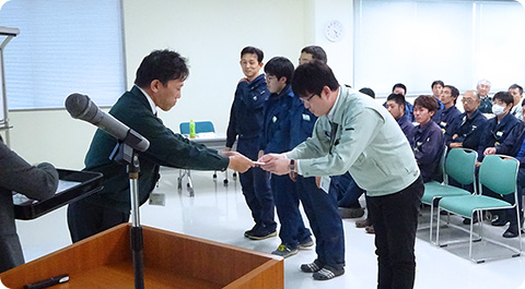社員表彰毎年年末に式典を行い、永年勤続表彰や、重要な資格取得者、業務改善で高い成果をあげた社員の表彰を行っています。